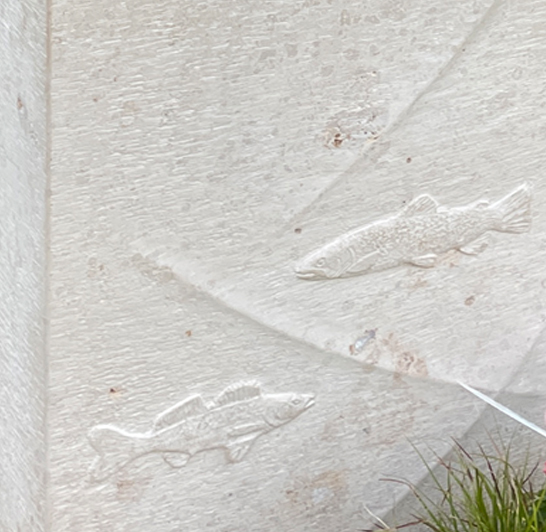 Am unteren Teil des Steins schwimmen Fische im See, die das Leben, die Bewegung und die Kontinuität darstellen. Diese lebendigen Elemente erinnern an die Natur und die Beständigkeit des Lebens, selbst in Zeiten des Abschieds.