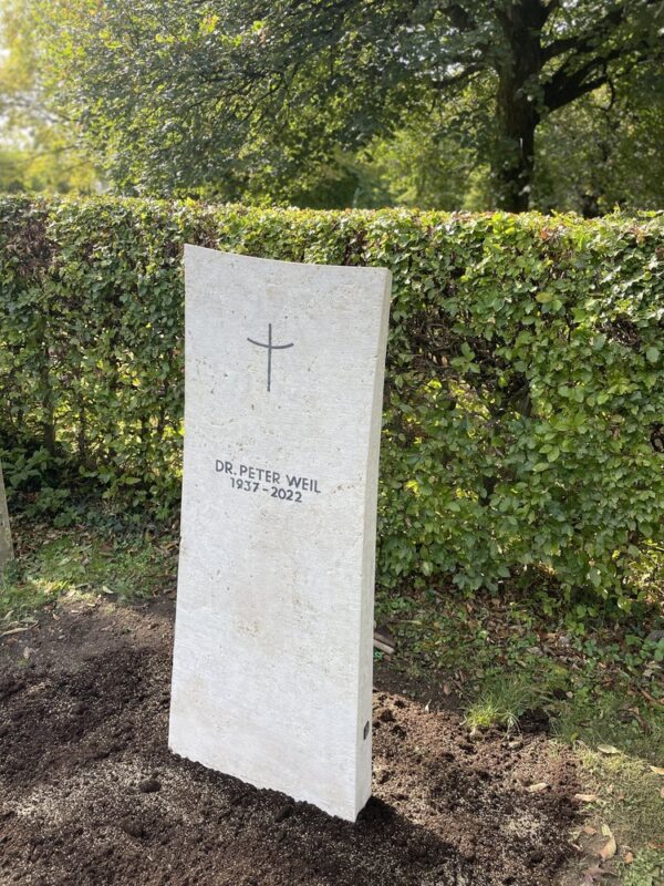 Dieser besondere Grabstein weist eine einzigartige, in sich verdrehte Form auf, die durch eine kunstvolle Bearbeitung angedeutet wird. Die Drehung im Stein steht für die Komplexität und den Fluss des Lebens, symbolisierend, dass das Leben des Verstorbenen reich an Erfahrungen und Emotionen war. Die Verengung in der Mitte des Grabsteins stellt die enge Verbundenheit zwischen dem Verstorbenen und den Hinterbliebenen dar. Diese symbolische Drehung erinnert daran, dass selbst in Zeiten der Trauer und des Verlusts eine tiefe Verbindung besteht, die über den Tod hinausgeht.